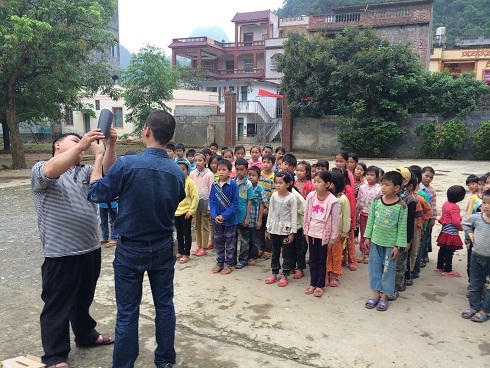武联村小学老师在演示如何使用台灯