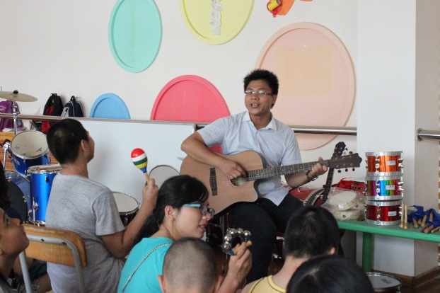 在活动之前,志愿者服务队利用休息时间进行了认真的排练,并专门学习了此次与特殊儿童进行学习和活动过程中应注意的事项。志愿者服务队于上午9点半到学校,他们的出现引起了孩子们的关注,有些孩子开始对志愿者们挥动双手,志愿者们笑着回应并开始了工作。他们为孩子们带去了彩笔、积木、图画本、卡片、橡皮泥等文体用品,一对一辅导孩子们画画和做游戏。随后,青年志愿者蒙文慧还为孩子们表演了吉他弹唱《兰花草》,孩子们也欢快地跟着边打拍子边唱起了歌。