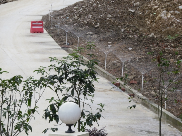 按传统做法,工地的扬尘治理基本靠人工洒水完成,如今在施工现场及塔吊装上喷淋系统,不仅可节约人力、物力,也收到降尘的良好效果。目前,塔吊喷淋系统在河池市并没有现成样本。项目部经过多次技术攻关,运用万向节、设置高压管等新技术成功攻克塔吊喷淋系统与塔吊吊臂同步工作、喷淋管影响后期塔吊顶升作业等技术难题。施工区3台塔吊全部装上了自动喷淋系统,吊臂360度的旋转,每天喷4次;施工地面还装有80个自动喷头,基本可以覆盖工地全部区域,大大降低了施工扬尘。