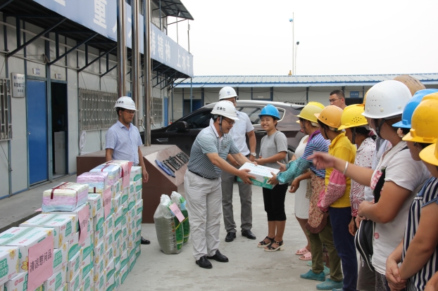 在活动中,兰副主席肯定了农民工兄弟在城市建设、发展中的中坚作用,向一线工人致以亲切的慰问,希望农民工兄弟姐妹今后继续为城市建设和集团公司的发展做出更大的贡献;同时提醒一线工人,目前正是“秋老虎”开始发威的时节,需关注天气的变化,注意身体健康问题。随后,集团公司慰问组和公司员工一起向农民工代表发放清凉饮料、洗浴毛巾等慰问品。