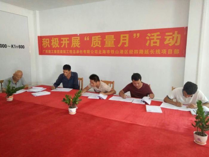 日前,国家质检总局等多部委联合印发了《关于开展2017年全国“质量月”活动的通知》(国质检质联〔2017〕374号),为深入贯彻实施《质量发展纲要(2011—2020年)》和集团公司相关文件要求,根据公司《2017年“质量月”活动方案》工作安排,北海市铁山港区经四路延长线(一期)工程项目部全体人员在项目执行经理黄雄勇的带领下积极响应各级关于“质量月”活动的号召,在深入学习文件精神的同时多措并举,把确保质量作为一切工作的出发点和落脚点。